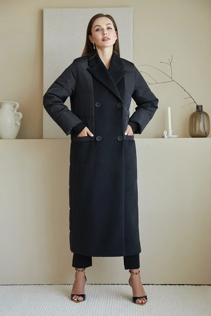 Зимнее пальто черного цвета, выполнено из двух видов ткани. Пальто прямого силуэта длиной до середины икры. Центральная двубортная застежка на петли и пуговицы. Воротник пиджачного типа. Перед изделия комбинированный: выполнен из плотной плащевой ткани с мембраной и пальтовой ткани в рубчик. На полочках горизонтальные подрезы с карманами. Спинка прямая, выполнена из плащевой ткани с мембраной. Втачной прямой рукав из плащевой ткани. Низ рукава на плотной трикотажной манжете. Подкладка – дизайнерская вискоза 100%