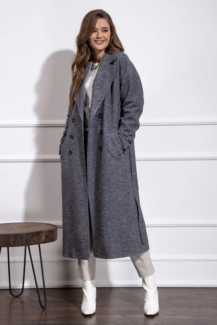 Стильное пальто прямого силуэта из шерстяной пальтовой ткани, однобортное с застежкой на 3 петли и пуговицы. Воротник отложной с цельнокроеным лацканом. По переду обработаны прорезные карманы с широкими листочками. Спинка со средним швом, заканчивающимся шлицей. Пальто со съемным поясом, который продевается в шлевки, расположенные по боковым швам. Изделие на подкладке с отделочным кантом.