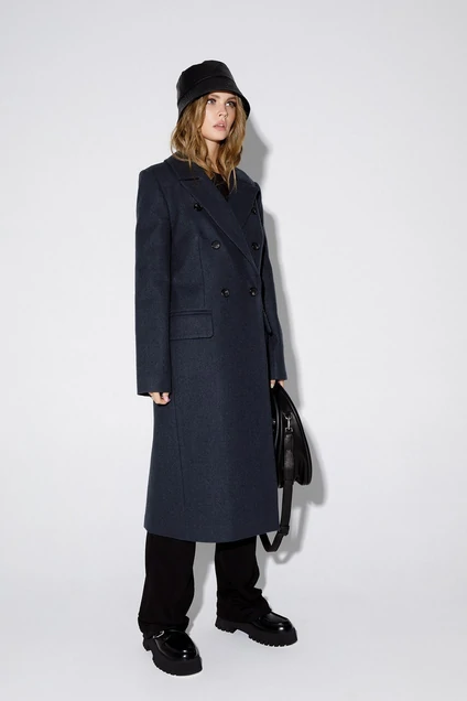 Двубортное шерстяное пальто со шлицей. Детали: полуприлегающий силуэт, талиевые вытачки, пиджачный воротник, перед с прорезными карманами с клапанами, отрезные бочки, застежка на петли и декоративные пуговицы, спинка со средним швом, втачные длинные рукава со шлицей, пальто на подкладке