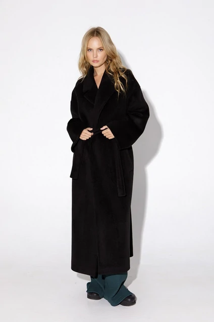 Свободное пальто-халат длины макси. Детали: прямой силуэт, спущенная линия плеча, перед с прорезными карманами, пиджачный воротник, двубортная застежка на пришивные кнопки, рукава длинные, съемный пояс со шлевками, пальто на подкладке