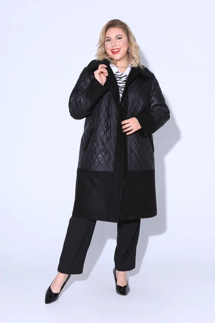Пальто полуприлегающего силуэта на утепленной подкладке со съемным меховым воротником. Детали переда и спинки выполнены из стеганой ткани со вставками из пальтовой ткани. Центральная застежка на пуговицыс планкой . Рукава втачные, двухшовные. Листочки боковых карманов из пальтовой ткани. Съемный воротник крепится навесными петлями на пуговицах.