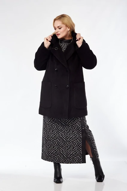 Свободное пальто прямого силуэта с рукавами реглан. Воротник пиджачного типа с отворотом лацкана. Застёжка двубортная. На деталях переда обработаны накладные карманы. Рукава с отворотами. Спинка со средним швом. Изделие на утеплённой подкладке.