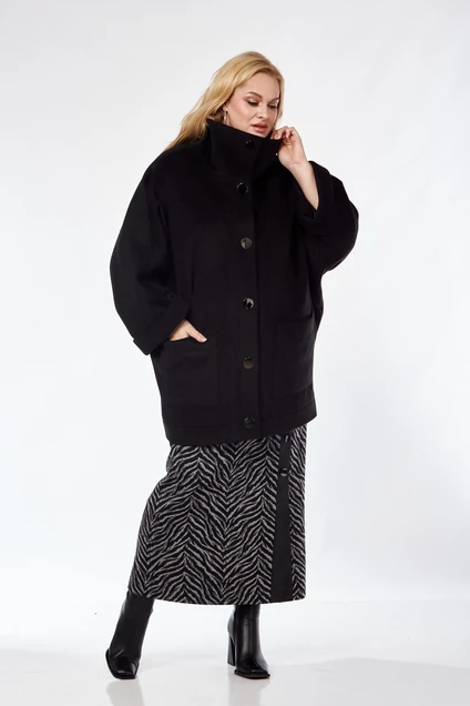 Свободное пальто с цельновыкроенными рукавами типа "летучая мышь" и высоким воротником-стойкой. На передних деталях обработаны накладные карманы, спинка со средним швом. Застёжка центральная на кнопки. Низ рукавов с отворотами притачных манжет. Изделие на утеплённой подкладке.