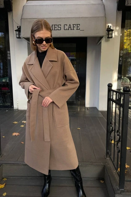 Классическое демисезонное пальто прямого силуэта, двубортное,на запах,без пуговиц, на подкладке. Пальто завязывается на пояс. Ткань- драп, с характерным переплетением на лицевой стороне (рубчик). Рукава длинные, втачные одношовные. Воротник пиджачного типа. Длина 120 см, рукав 45 см. ОГ 112,116,120 см