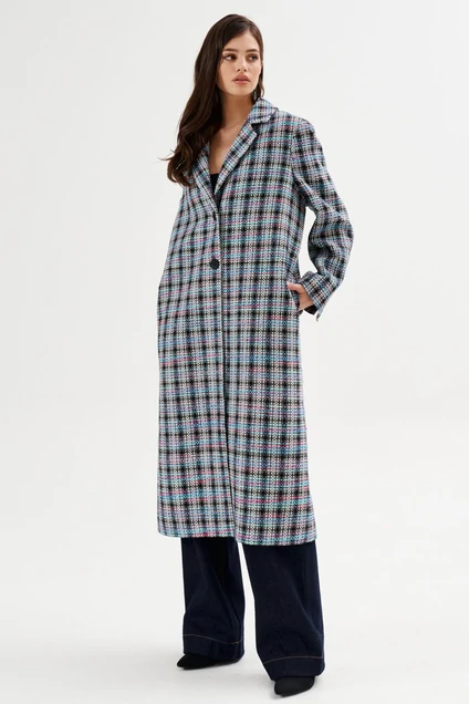 Пальто прямого силуэта, длиной до середины икры. Спинка со средним швом и щлицей. В боковых швах карманы. Рукава двушовные, длинные. В локтевом шве шлица и пришиты пуговицы. Воротник пиджачного типа с лацканом. Застежка по переду на петли и пуговицы. Пальто на подкладке.