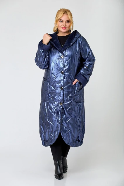 Пальто женское из стеганой ткани на меху, свободного силуэта с цельнокроеным рукавом и капюшоном, с застежкой на петли и пуговицы. Вырез глубины горловины регулируется на потайную петлю и пуговицу. По переду большие накладные карманы. Низ рукава регулируется отворотом. По низу пальто в области боковых швов присобрано на резинку, что создает объем.