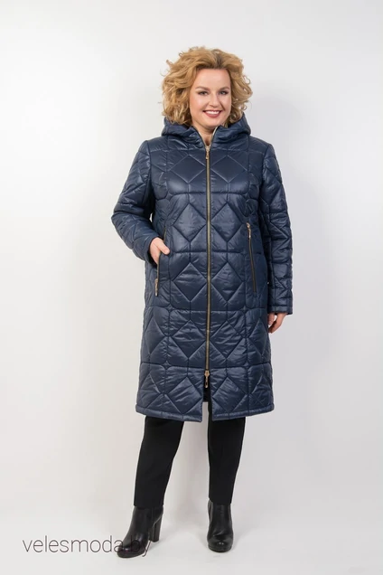 Пальто прямого силуэта утепленное. Глубокие наклонные карманы и борта с капюшоном типа "анорак" застегиваются на отдельную тесьму-молнию. Внутрення часть капюшона, обтачки низа, рукавов, подборта и мешковины карманов могут быть выполнены в отделочном цвете. Длина изделия - 101 см, длина рукава - 62 см.