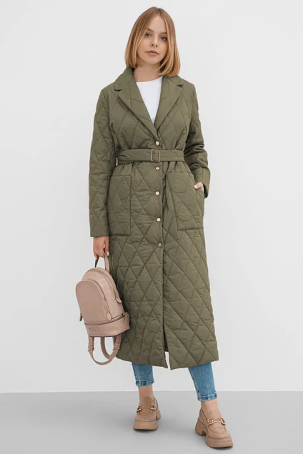 Стильное стеганое пальто выглядит изысканно, оригинально и элегантно. Пальто женское, прямого силуэта, на притачной подкладке, из стёганой ткани с центральной бортовой застежкой на 5 кнопок (размер, форма и цвет пуговиц могут незначительно отличаться). Перед пальто с накладными карманами, расположенными чуть ниже линии талии, вход в карман с бокового шва. Углы кармана прямой формы. Спинка без среднего шва. Рукава втачные двухшовные, длинные. Воротник пиджачного типа с отложными лацканами. Углы воротника и лацкана закругленные. Пальто со съемным завязывающимся поясом с пряжкой и пришивной вешалкой.