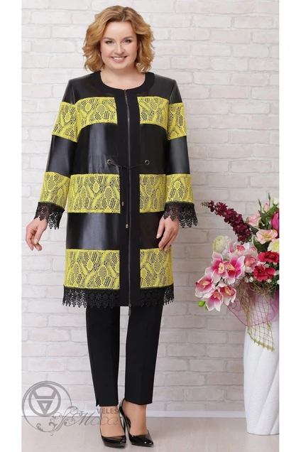 Женский плащ свободного силуэта, выполнен из ткани двух видов: экокожи и кружева (кружево нашито на ткань). Круглый вырез горловины. Перед и спинка без вытачек. В плаще обработана кулиса, в которую втянут декоративный шнур, что позволяет фиксировать линию талии. Рукав втачной, длинный. Плащ без карманов и капюшона. Застежка: центральная молния. Плащ без подкладки и утеплителя. Изделие с плечевыми накладками. Ткань плохо тянется. По низу и на рукавах пришито кружево (дизайн кружево может отличаться). Планка и горловина из плотного трикотажа. Длина изделия по спинке: 95 см. Длина рукава: 63 см.