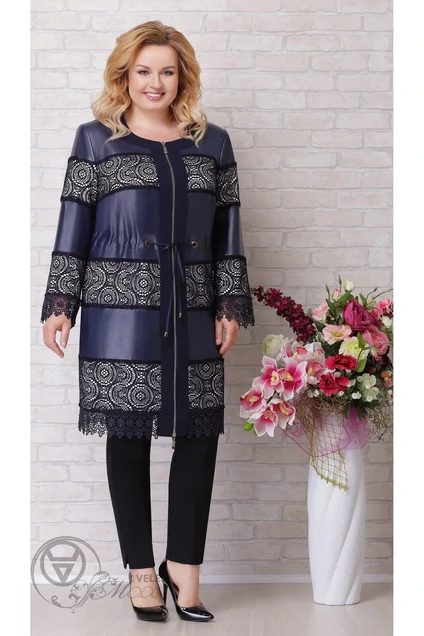Плащ женский прямого силуэта, без подкладки, с плечевыми накладками, с центральной бортовой застежкой на разъемную тесьму-«молнию». Плащ выполнен из искусственной кожи и кружева. Кружевные детали с подкладкой из стабильной ткани. По горловине и бортам планки из отделочной ткани. Низ изделия и рукавов отделан притачным кружевом. На линии талии расположена кулиска со шнуром. Перед и спинка состоят из стачных, горизонтально расположенных деталей. Рукава втачные, одношовные, по дизайну повторяют перед и спинку. Горловина круглой формы, обработана обтачкой. Длина по центру спинки 98 см. Длина рукава 60 см.