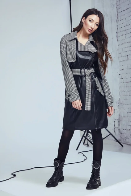 Ультрамодный тренчкот, сочетающий в себе принт пье-де-пуль и эко кожу. Полуприлегающий силуэт, двубортная застежка на металлическую разъемную тесьму-молнию. Воротник стояче-отложной. На правой половинке переда и на спинке отлетные кокетки. Рукав втачной, двухшовный, длинный. На рукавах паты с петлей и пуговицей. Отделкой служат погоны и клапаны карманов. Карманы спереди по бокам, наклонные, прорезные с рамкой и клапаном. Тренчкот на подкладке. В комплекте пояс с пряжкой из эко кожи.