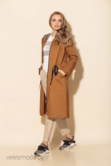 Парка oversize на подкладке из хлопкового полотна. Застежка центральная на металлическую тесьму-молнию. Горловина с капюшоном на кулисе. Линия плеча спущена, рукава втачные с патами на пробивных кнопках по низу. По линии талии и по низу обработана кулиса. По переду обработаны карманы-листочки и накладные карманы. Спинка слегка ниже переда. Длина изделия - 111,5 см. Длина рукава - 60 см.