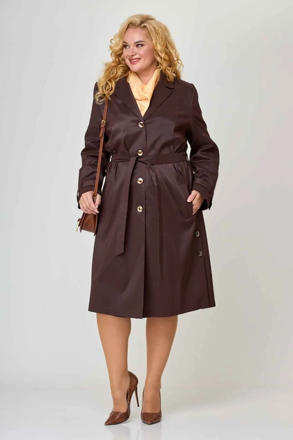 Плащ женский свободного силуэта, на подкладке, выполнен из плащевой ткани. Воротник с бортами, застёжка центральная на пуговицы. По переду нагрудные вытачки, спинка свободная. Рукав длинный с патами на пуговицу. В боковых швах шлицы, на пуговицы. В области ниже линии талии по переду карманы с листочками. К изделию прилагается пояс. Длина изделия: 113 (±2) см. Длина рукава: 65 (±1) см.