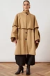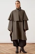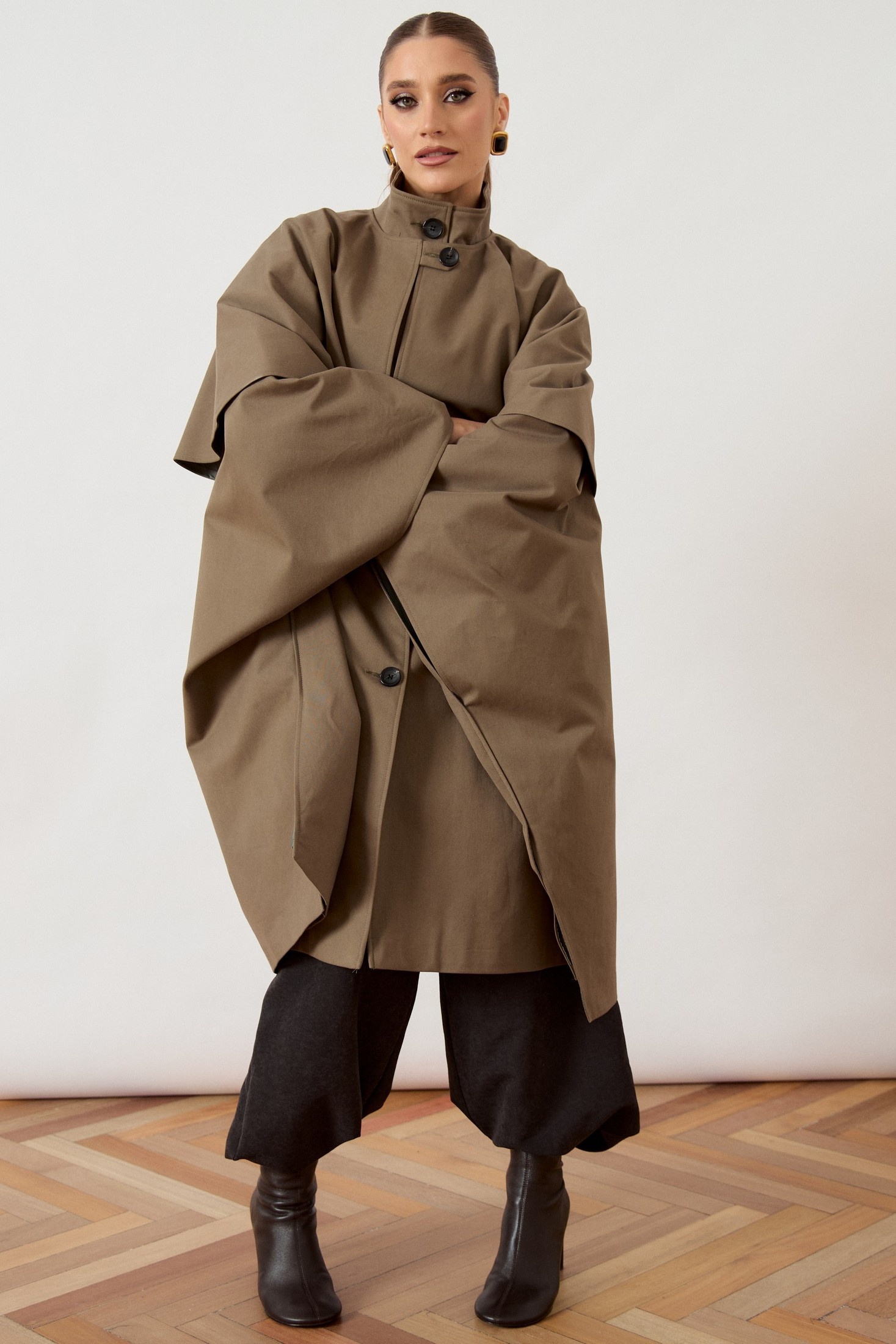 Тренч женский, свободного силуэта, из костюмно-плащевой ткани. Модель с воротником-стойкой и застежкой на петли и пуговицы. Изделие дополнено объемной отлетной кокеткой по переду и спинке, имитирующей кейп. Рукав цельнокроеный, переходящий в широкую форму, с разрезами в нижней части для свободы движения. Перед с вертикальными прорезными карманами в швах. Изделие на подкладке.