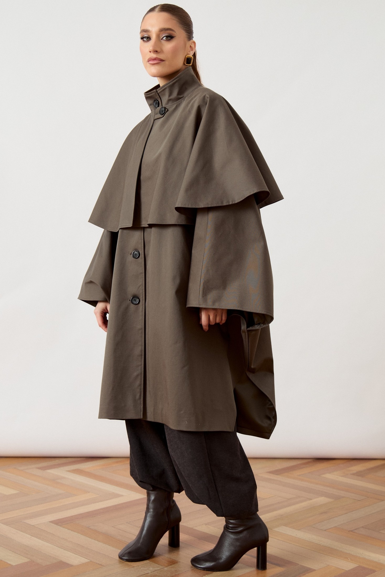 Тренч женский, свободного силуэта, из костюмно-плащевой ткани. Модель с воротником-стойкой и застежкой на петли и пуговицы. Изделие дополнено объемной отлетной кокеткой по переду и спинке, имитирующей кейп. Рукав цельнокроеный, переходящий в широкую форму, с разрезами в нижней части для свободы движения. Перед с вертикальными прорезными карманами в швах. Изделие на подкладке.