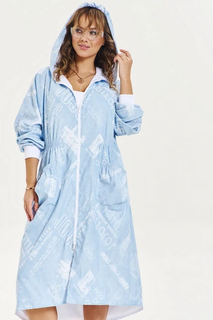 Удлиненная парка - дождевик с капюшоном из водонипроницаемой принтованной плащевки свободного силуэта, длиной чуть ниже колена спереди и удлиненной спинкой, с застежкой на молнию спереди. Рукав свободный, длинный, с трикотажной манжетой и сборкой на локтевой части. Линия плеча спущена. На переде два объемных накладных кармана. По линии талии частичная кулиса с резинкой. Спинка со средним швом. Изделие на подкладке. Парка оверсайз, выпускается в двух базах: 44-48 и 50-54.