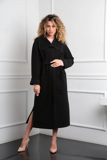 Невероятно комфортный удлинённый плащ из двухсторонней ткани типа кашемир. Без подкладки, с изнанки – ткань в рубчик. Силуэт прямой, с центральной застежкой на потайные пришивные кнопки. Длина изделия 122 см. Плащ отрезной по линии бедер. Рукав втачной спущенный одношовный, прямой. В низу рукава имеется отворот, отделанный декоративной тесьмой, позволяющий регулировать его длину. На уровне бедер по переду изделия выполнены потайные карманы. По бокам изделия расположены высокие разрезы, украшенные металлической фурнитурой. Воротник отложной, отлетной, отделан декоративной тесьмой. К изделию прилагается широкий пояс из основной ткани.