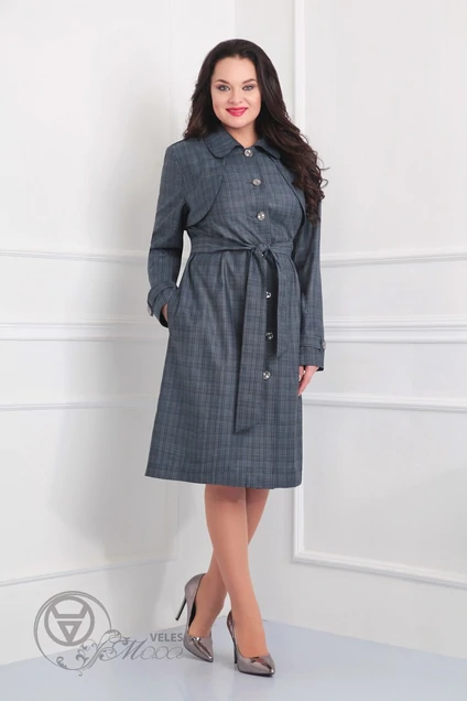 Плащ женский расширенного силуэта длиной ниже колена со съёмным поясом.Перед с отлетными кокетками круглой формы, идущими от боковых швов в горловину и нагрудными вытачками от плечевых швов. В швах втачивания рукава в пройму по плечевым швам расположены паты, закреплённые пуговицами на концах. В боковых швах обработаны карманы.Спинка со средним швом и широкой отлетной кокеткой. По низу кокетки пришита пуговица.Воротник на отрезной стойке с закруглёнными концами.Рукава втачные двухшовные с передними и локтевыми швами. По низу рукавов в передних швах расположены паты, закреплённые шлёвками и пуговицами на конце.Плащ на отлетной подкладке, с плечевыми накладками.Отделкой служат отделочные строчки по краям кокеток, по поясу, патам и воротнику. _____________________________________________________________________________________________________________ Длина изделия 103см Длина рукава 64см