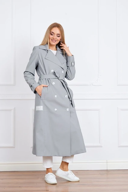 Плащ женский из кожзаменителя. Прямого силуэта под поя из того же материала,2-бортный с застежкой на петли и пуговицы до верха,с отложным воротником на стойке.По переду и спинке подрезы -горизонтальные и вертикальные с отсрочкой ,карманы с листочкой в швах переда,изделие на подкладке.В отделке использовалась тесьма в тон изделия и наклейки в виде текста.