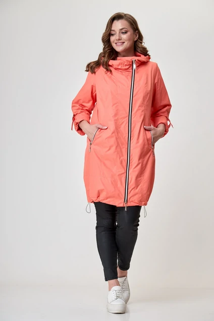 Плащ женский, прямого силуэта, на подкладке. Со смещенной центральной застежкой на металлическую тесьму-молнию, с втачным капюшоном. Полочка с вертикальными рельефами и карманами на молниях. Спинка со средним швом и вертикальными рельфами. В изделии все швы отстроченвы в тон плаща. Рукав втачной, двухшовный, с притачной патой. Длина рукава 48 см, длина по спинке 90 см.