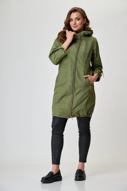 Плащ женский, прямого силуэта, на подкладке. Со смещенной центральной застежкой на металлическую тесьму-молнию, с втачным капюшоном. Полочка с вертикальными рельефами и карманами на молниях. Спинка со средним швом и вертикальными рельфами. В изделии все швы отстроченвы в тон плаща. Рукав втачной, двухшовный, с притачной патой. Длина рукава 48 см, длина по спинке 90 см.