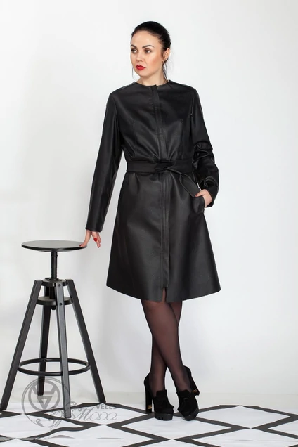 Плащ женский полуприлегающего силуэта из эко кожи, отрезной по линии талии. Прилегание достигается за счет нагрудных вытачек по переду, идущих от подреза. На полочке обработаны карманы в рамку, застежка- молния спереди, рукав втачной длинный. Длина изделия- 100 см, длина рукава- 60 см.