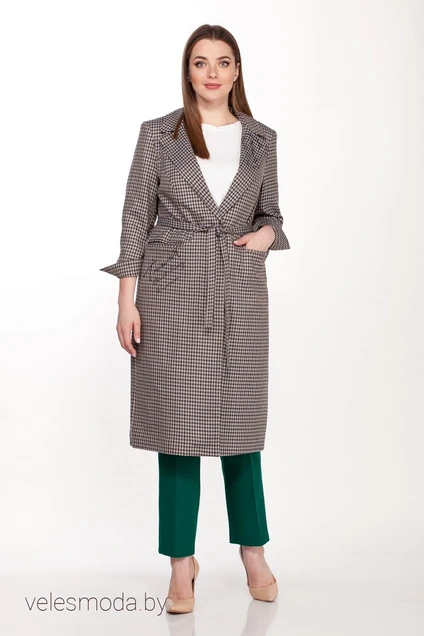 Жакет женский удлиненный полуприлегающего силуэта выполнен из плотной костюмной ткани в клетку с добавлением эластана на подкладке, застежка центрально- бортовая, застегивается на две петли и пуговицы и съемный пояс, воротник втачной с отложным лацканом, рукав втачной 3/4 двухшовный с разрезом, на полочке обработаны функциональные карманы с листочкой. На лацкане воротника и в области кармана на полочке термоаппликации. Длина плаща 110 см, рукава 52 см.
