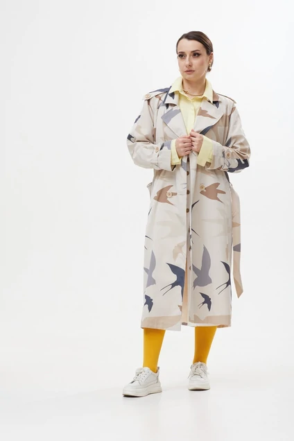 Двубортный плащ-тренч среднего объема, прямого силуэта, на подкладке. Рукава покроя реглан. По плечам и низу рукавов расположены паты с прорезными петлями. На переде карманы с прорезной листочкой. На правой детали переда отлетная кокетка, застегивается на пуговицу. Спинка также с отлетной кокеткой. Воротник стояче-отложной, на отрезной стойке. Застежка центральная на два ряда петель и пуговиц. Пояс съемный.