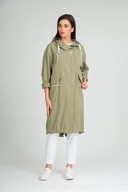 Плащ женский, прямого силуэта с центральной застёжкой на кнопки, линия плеча спущенная, втачной рукав одношовный с локтевой вытачкой. По спинке кокетка, средний шов, заканчивающийся разрезом. Кулиса по линии талии и по линии низа. По переду прорезные карманы с листочкой с втачными концами, и отделочным клапаном, кулисой по линии талии и по низу. Капюшон с застёжкой на кнопки, с центральной частью, с кулисой по внешнему срезу. с отделочным шнуром. В качестве отделки используется фурнитура. отделочная строчка и детали. Плащ без подкладки.Длина по спинке 109 см. , длина рукава 54 см.