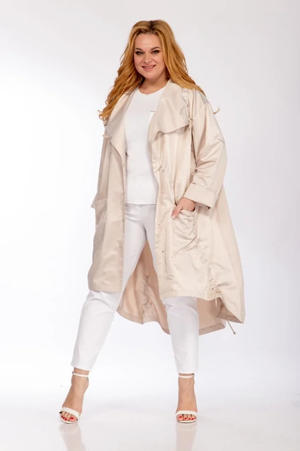 Плащ женский свободного кроя А-образного силуэта с центральной бортовой застёжкой на кнопки. Спинка с двумя ассимметричными кулисами и шнуром. Перед с накладными карманами. Рукав втачной одношовный со спущеннойлинией плеча. Воротник - апаш с ассимметрично настроченными кулисами со шнуром. Низ полукруглой формы спереди короче сзади длиннее.Длина по спинке 123 см. , длина рукава 56 см.