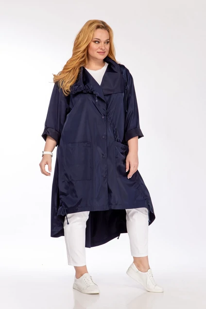 Плащ женский свободного кроя А-образного силуэта с центральной бортовой застёжкой на кнопки. Спинка с двумя ассимметричными кулисами и шнуром. Перед с накладными карманами. Рукав втачной одношовный со спущеннойлинией плеча. Воротник - апаш с ассимметрично настроченными кулисами со шнуром. Низ полукруглой формы спереди короче сзади длиннее.Длина по спинке 123 см. , длина рукава 56 см.