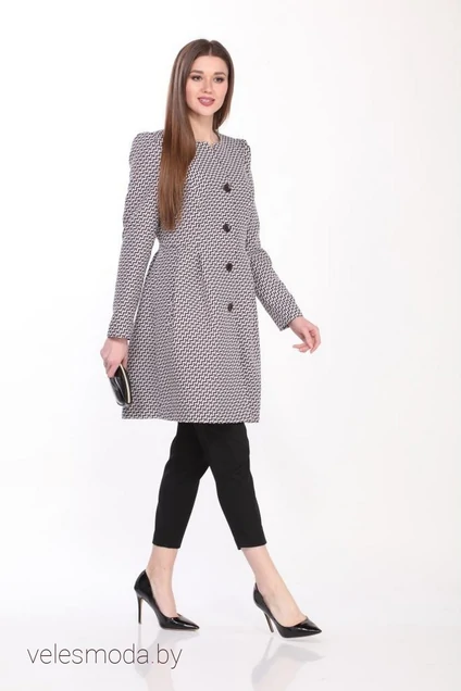 Плащ женский полуприлегающего силуэта на подкладке. Спинка отрезная по талии со средним швом. По спинке декоративная пата на 2 пуговицы. По переду идут рельефы. Перед на центрально-бортовой застежке на 4 петли и пуговицы. По нижней части плаща идут мягкие складки. Рукав втачной со сборкой по окату. Горловина фигурной формы.
