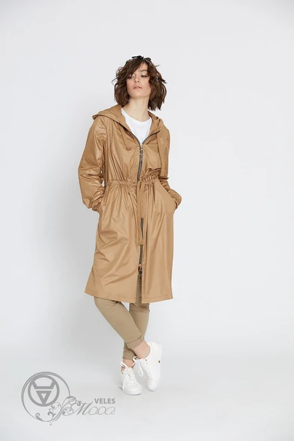 Плащ женский , повседневный ,свободного силуэта , длиной ниже линии колен из текстильной ткани . Перед с таливыми выточками , застежкой на декоративную молнию . Плащ отрезной по линии талии , кулисой из декоративного шнура . Вырез горловины обработан двойным капюшоном из отделочной ткани , подтяжкой из декоративного шнура . Рукав втачной , одношовный , по низу обработан притачной манжетой на резинке . Плащ на подкладке . По низу в боковых швах - разрезы обработаны обтачкой . карманы в боковых швах . Длина 103, рукав 63.