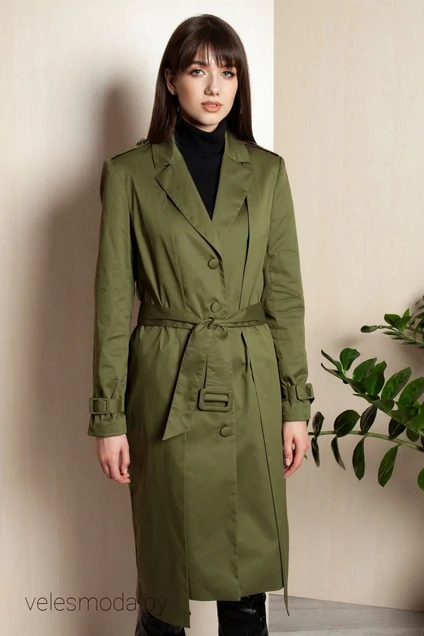Плащ женский, нарядный,полуприлегающего силуэта, длиной ниже линии колен, из текстильной ткани. Перед двойной с отлетным верхом, рельефами, прорезными карманами с листочкой, застежкой на петли, пуговицы. Спинка с центральным швом, книзу переходящий в шлицу. Рукав втачной, двухшовный, по низу с притачной патой на декоративной пряжке. Вырез горловины обработан воротником пиджачного типа. Плащ на подкладке. В коиплекте пояс с основной пткани. Длина изделия - 109 см. длина рукава- 61см