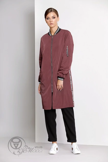 Плащ-бомбер выполнен из плащевки с отделкой из декоративной тесьмы с буквами, плащ на подкладке из хлопковой ткани, застежка на металлическую разъемную молнию. Длина плаща: р.44-48 - 99 см, р.50-54 - 101 см. Длина рукава: р.44-48 - 64 см, р.50-54 - 65см.