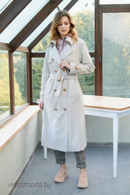 Плащ в стиле тренчкот-модный и стильный атрибут женского сезонного гардероба. Выразительная двубортная застежка на пуговицы, широкий отложной воротник, отлетные кокетки. Декором выступают детали в стиле "милитари" - погоны, шлёвки, паты рукавов. Затянутый на талии широким поясом тренчкот всегда выглядит безупречно и стильно. Силуэт прямой, рукава втачные на слегка спущенной мягкой линии проймы, двухшовные с регулируемыми патами. Спинка с отлетной кокеткой и встречной складкой ниже линии талии. Плащ со съемным поясом на пряжке. Плащ на подкладке, отлётной по линии низа. Длина изделия по спинке около 112 см. Длина рукава около 61 см