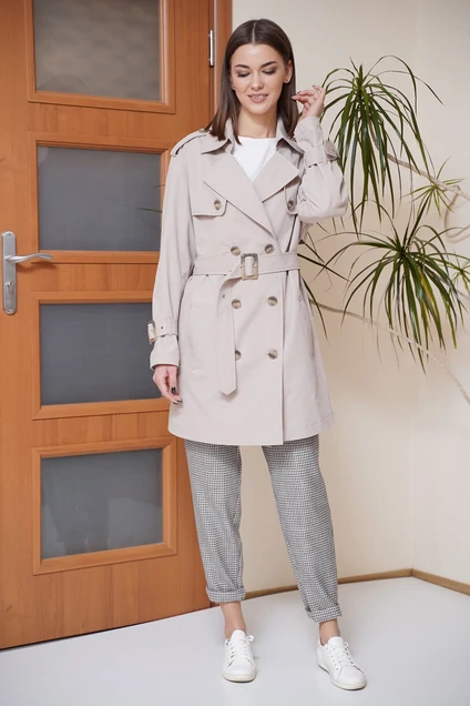 Тренчкот не выходит из моды с тех пор, как Коко Шанель представила этот вид одежды в женской, ведь до этого тренч являлся исключительно мужской одеждой. Сегодня этот вид плаща можно смело назвать базовым, его актуальность переходит из сезона в сезон. Классический вариант тренча в укороченном варианте с поясом, отложным воротником на притачной стойке, погонами, шлицей сзади, отлетными кокетками по переду и спинке, и двубортной застежкой в бежевом цвете. Рукава втачные двухшовные на слегка заниженной линии проймы со съемными патами на пряжках по линии низа. Карманы прорезные с листочками. Все фигурные линии отделочных деталей подчёркнуты широкими отделочными строчками. В качестве фурнитуры выбраны стильные роговые пуговицы и пряжки, серебристые люверсы. Плащ на отлётной по линии низа подкладке. Длина изделия по спинке около 84 см. Длина рукава - 61 см.