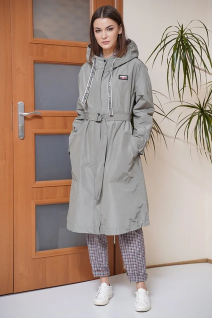 В весеннем сезоне 2021 на пике моды сочетание стилистической направленности и эффектности используемого материала. Свободный упрямленный силуэт рубашечного покроя с заниженной линией плеча. Полочка с застежкой на тесьму-молнию, закрытую планкой, ассиметричной отлетной кокеткой и сложными втачными карманами с листочкой. Кулиса по низу изделия с регулировкой. Рукав с частичной резинкой по низу, фиксирующей его ширину. Плащ с капюшоном и съемным поясом.