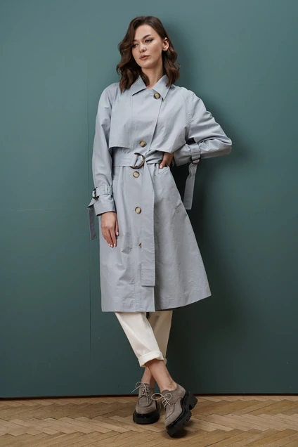 Плащ- необходимая вещь в гардеробе, ведь он отличается редким удобством и практичностью. Модный элемент гардероба составляет важную стилевую деталь в общем облике женщины. Не покидая трендов, не один сезон, плащ точно отражает все самые актуальные тенденции. Плащ прямого силуэта покроя реглан с отлетной кокеткой по переду и спинке. Встречная складка кокетки спинки с отделочными пуговицами. Перед плаща с широкой планкой по центру, переходящей в воротник пиджачного типа. Карманы наклонные с прорезными широкими листочками. По низу рукавов - шлевки с фиксирующими длинными патами на полукольцах. Спинка со шлицей по линии низа. Пояс съёмный широкий на полукольцах. Плащ на подкладке, отлетной по линии низа. Длина изделия по спинке около 107 см. Длина рукава реглан от шва втачивания в горловину до низа около 73 см.