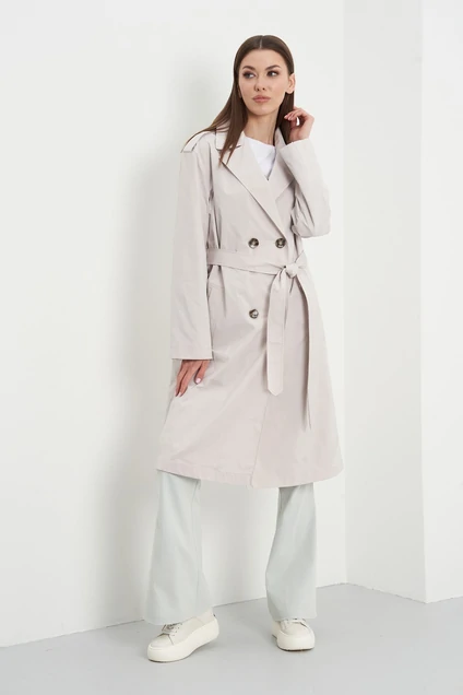 Свободный, слегка расширенный к низу силуэт, втачной, с заниженной линией плеча покрой, классический английский воротник, двубортная застежка. Полочки с прорезными карманами с листочками, спинка – с отлетной кокеткой. Рукав двухшовный, по плечевым швам – отделочная пата-погон. Модель дополнена поясом, эффектно подчеркивающим линию талии.