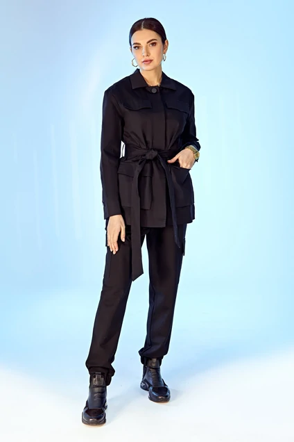 Укороченный плащ прямого силуэта со втачными рукавами. По переду накладные карманы и клапаны, потайная застежка на петли и пуговицы, втачной воротник со стойкой. Внутренние швы окантованы яркой подкладкой.