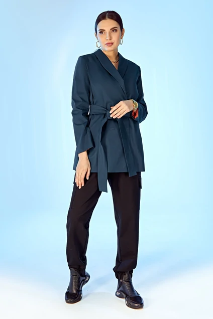 Укороченный плащ прямого силуэта на подкладке яркого цвета. Плащ на запах со смещенной двубортной застежкой на потайные кнопки, воротник "шаль", рукава втачные, в боковых швах карманы и шлевки для съемного пояса.