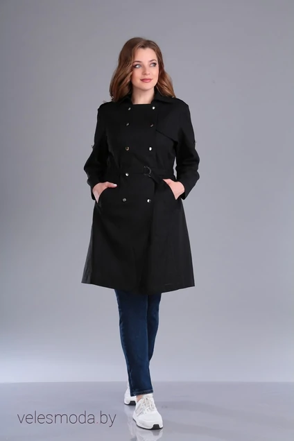 Летний плащ из натурального льна со втачными рукавами и двубортной застежкой, по переду прорезные карманы и декоративный пояс, по спинке и по левой половине переда отлетные кокетки. По талии кулиска с резинкой, по рукавами паты для регулировки длины. По спинке шлица. Длина 94 см, рукав 58 см.