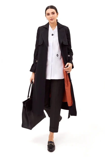 Тренч свободного силуэта на подкладке со втачными рукавами. Центральная застежка на петли и пуговицы, по переду прорезные карманы с листочками и отлетные кокетки. Воротник пиджачного типа, на рукавах паты. По спинке отлетная кокетка с декоративной деталью, на которой выполнена фирменная вышивка. А также сзади на стойке воротника вышито название бренда. В боковых швах шлевки для съемного пояса. Подкладка в тренче отлетная, закрепленная по низу. длина изделия в базовом размере, см 112 см, длина рукава 62 см.