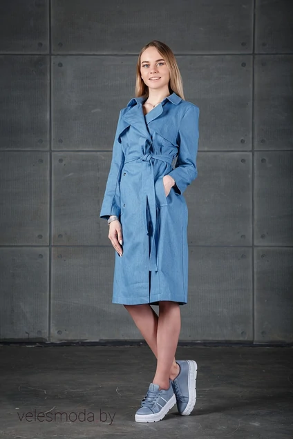 Плащ-платье демисезонный свободного кроя из джинса без подкладки. По переду и спинки рельефы от плеча, мягкие отлетные кокетки по лифу. Воротник стояче-отложной с лацканом на двубортную застежку. Застегивается - 6 сквозных кнопок и съемный пояс. Рукав втачной двухшовный. Наличие карманов в передних рельефах дополняют комфорт и необходимость плаща в своем гардеробе.