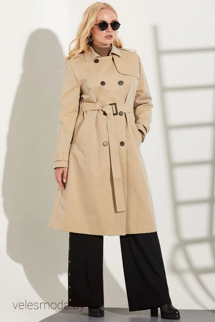 Плащ с центральной двубортной застежкой на петли и пуговицы, втачным воротником с отрезной стойкой. По переду с отрезными кокетками, прорезными карманами с листочками. На левом переде- отлетная кокетка. Спинка со средним швом, заканчивающимся шлицей, отлетной кокеткой. На плечах и по низу рукавов- паты, зафиксированные шлевками и петлями с пуговицами. Плащ со съемным поясом.