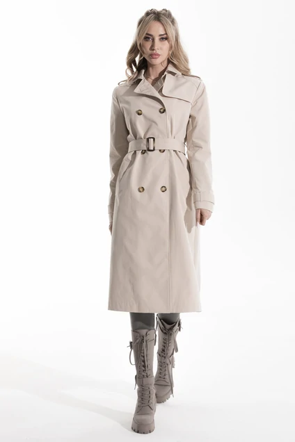 Плащ с центральной двубортной застежкой на петли и пуговицы, втачным воротником с отрезной стойкой. По переду с отрезными кокетками, прорезными карманами с листочками. На левом переде- отлетная кокетка. Спинка со средним швом, заканчивающимся шлицей, отлетной кокеткой. На плечах и по низу рукавов- паты, зафиксированные шлевками и петлями с пуговицами. Плащ со съемным поясом.