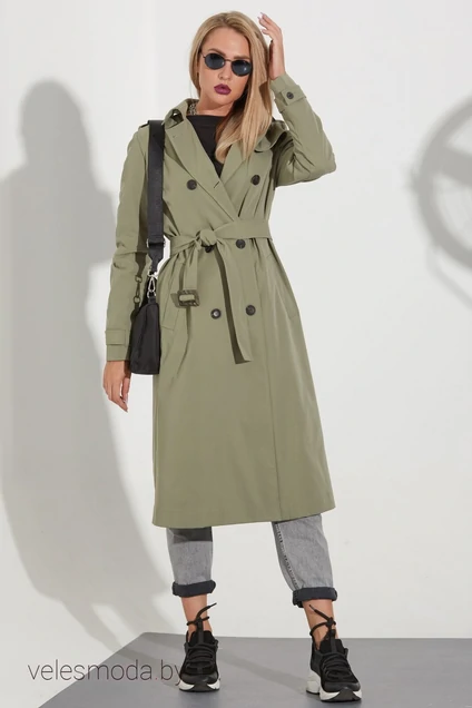 плащ с центральной двубортной застежкой на петли и пуговицы, втачным воротником с отрезной стойкой. По переду с отрезными кокетками, прорезными карманами с листочками. На левом переде- отлетная кокетка. Спинка со средним швом, заканчивающимся шлицей, отлетной кокеткой. На плечах и по низу рукавов- паты, зафиксированные шлевками и петлями с пуговицами. Плащ со съемным поясом.