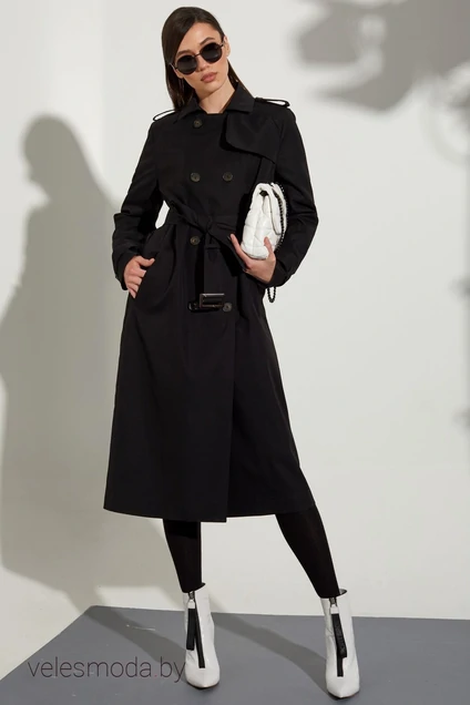 Плащ с центральной двубортной застежкой на петли и пуговицы, втачным воротником с отрезной стойкой. По переду с отрезными кокетками, прорезными карманами с листочками. На левом переде- отлетная кокетка. Спинка со средним швом, заканчивающимся шлицей, отлетной кокеткой. На плечах и по низу рукавов- паты, зафиксированные шлевками и петлями с пуговицами. Плащ со съемным поясом.