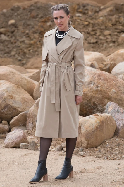 Плащ с центральной двубортной застежкой на пришивные кнопки, втачным воротником , отложными лацканами. По переду с отлетной кокеткой, прорезными карманами с листочками и клапанами, застегивающимся на кнопки. На переде- паты для пояса. Спинка цельная с патами для пояса. На по низу рукавов- паты, зафиксированные шлевками и петлями с пуговицами. Плащ со съемным поясом.